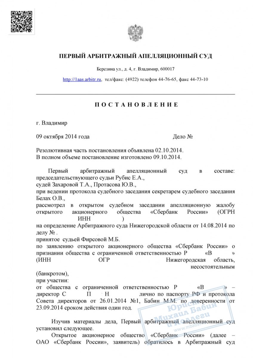 Тем не менее, кредитор не оставил попыток признать «Р.В.» банкротом. Была подана жалоба на решение суда об отсрочке, а также заявление и апелляция в арбитражные суды первой и второй инстанции. Однако все предпринятые кредитором усилия оказались напрасными. Руководитель нашей компании сумел отстоять право ООО «Р.В.» на отсрочку выплаты долга на всех уровнях.