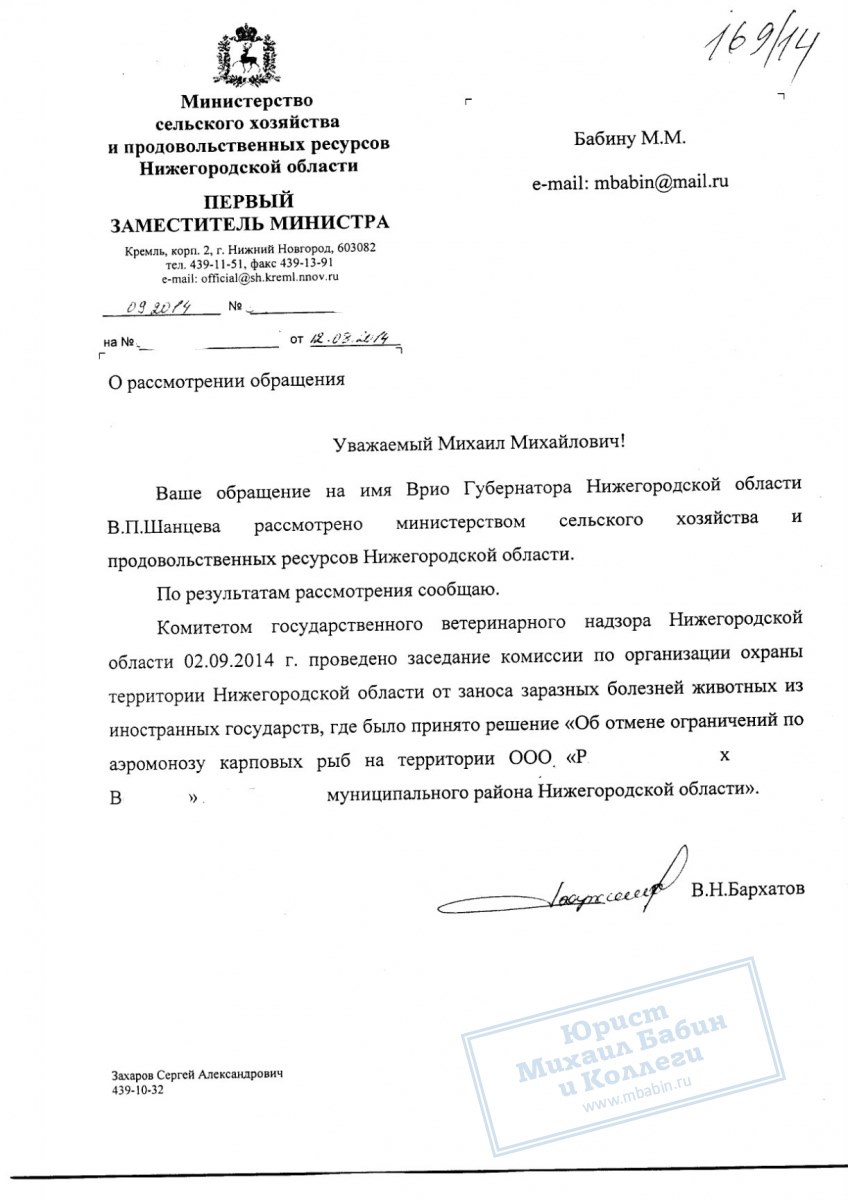 • Министерство сельского хозяйства Нижегородской области сняло запрет на реализацию продукции, что позволило ООО «Р.В.» возобновить хозяйственную деятельность и погасить долги.