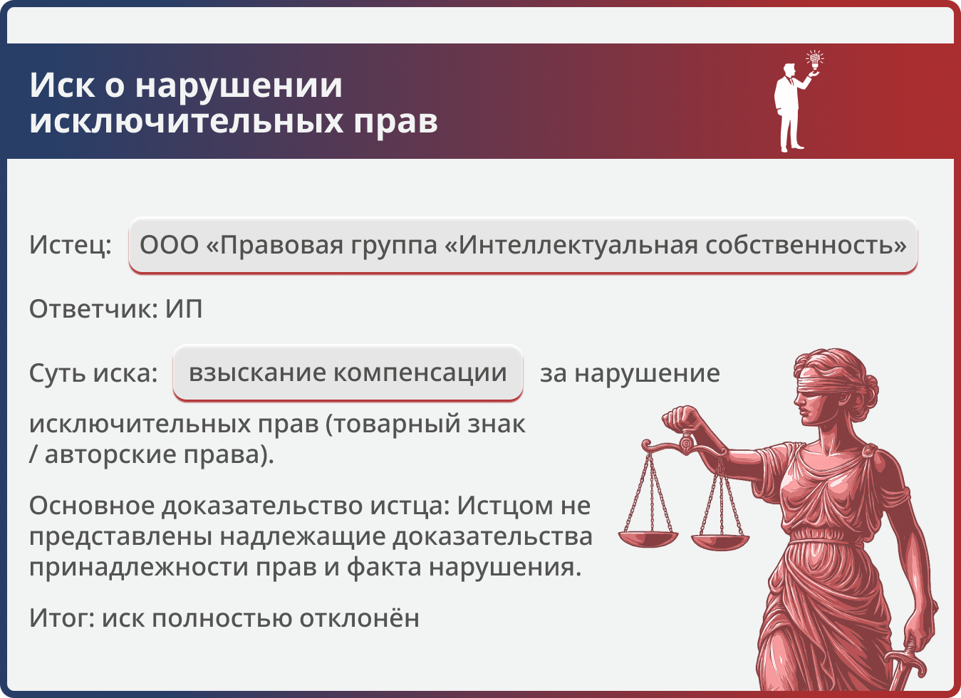 Профессиональный истец — ООО «Правовая группа „Интеллектуальная собственность“» — требовал компенсацию за нарушение исключительных прав. Юристы «Оригинальное решение» доказали в суде, что истец не представил ни одного доказательства: ни принадлежности ему прав, ни факта продажи товара ответчиком. Суд иск отклонил полностью.