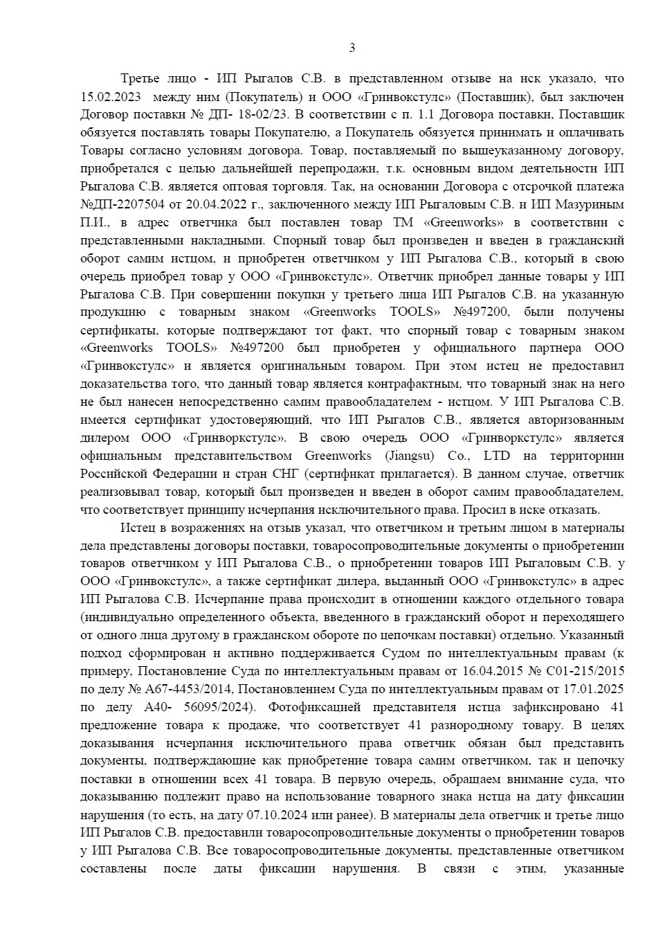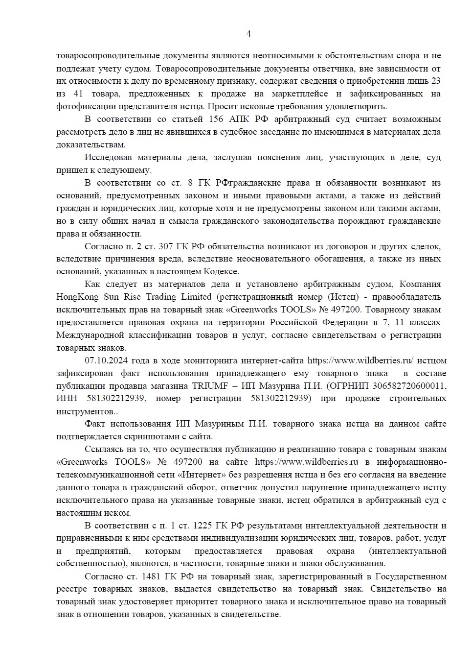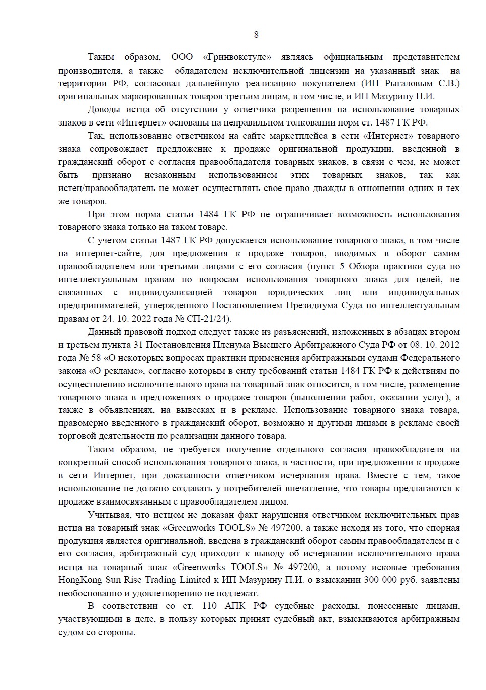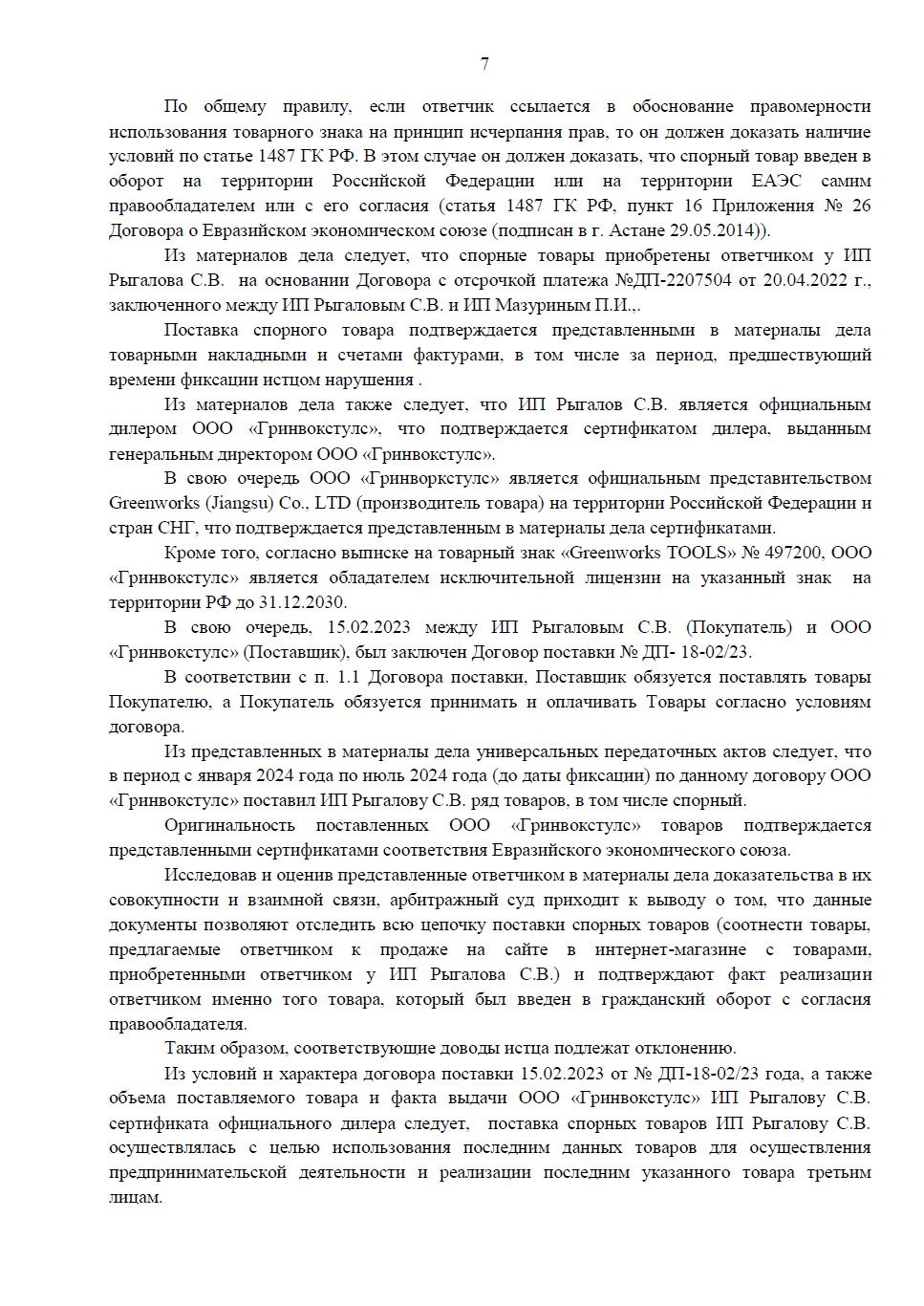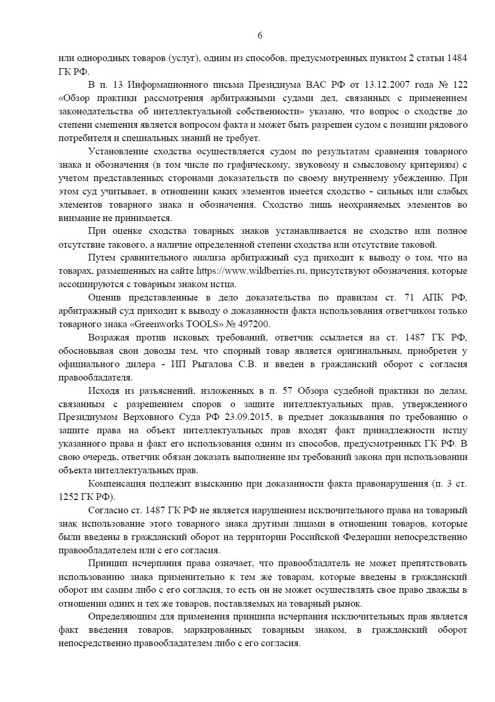 Правообладатель товарного знака «Greenworks» требовал компенсацию за продажу инструмента на Wildberries. Юристам «Оригинальное решение» удалось доказать, что товар является оригинальным и был введен в оборот с согласия самого правообладателя через цепочку официальных дистрибьюторов. Суд полностью отказал иностранной компании в иске.