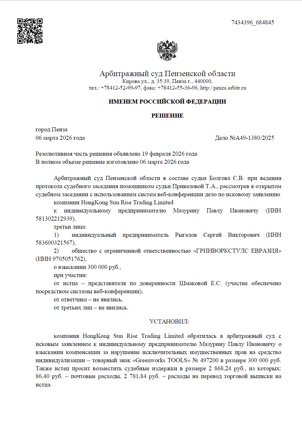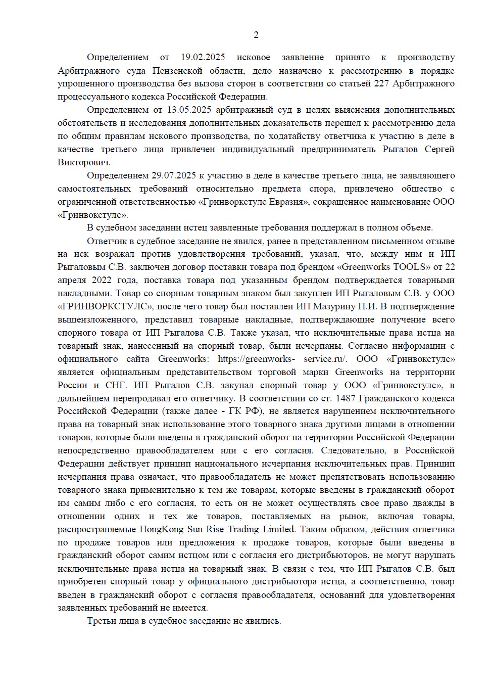 Иск подала гонконгская компания HongKong Sun Rise Trading Limited к пензенскому предпринимателю Мазурину П.И. В ходе рассмотрения дела суд по ходатайству ответчика перешёл от упрощённого производства к общим правилам искового производства и привлёк к участию двух третьих лиц: поставщика ответчика (ИП Рыгалова С.В.) и официального представителя бренда в России (ООО «Гринворкстулс Евразия»).