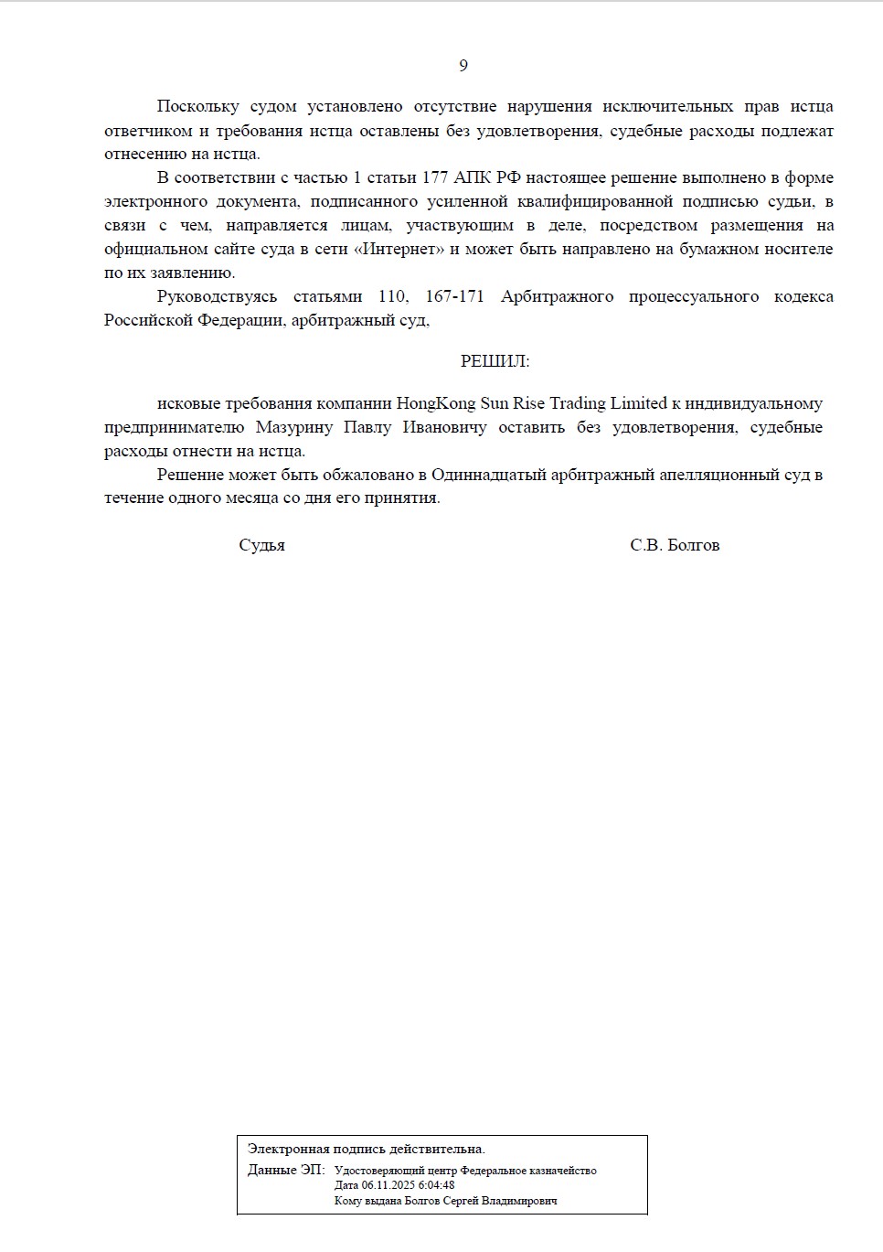 Арбитражный суд Пензенской области полностью отказал компании HongKong Sun Rise Trading Limited в удовлетворении исковых требований. Суд согласился с нашей позицией, признав, что представленные доказательства позволяют отследить всю цепочку поставки и подтверждают введение товара в оборот с согласия правообладателя. Судебные расходы отнесены на истца.
