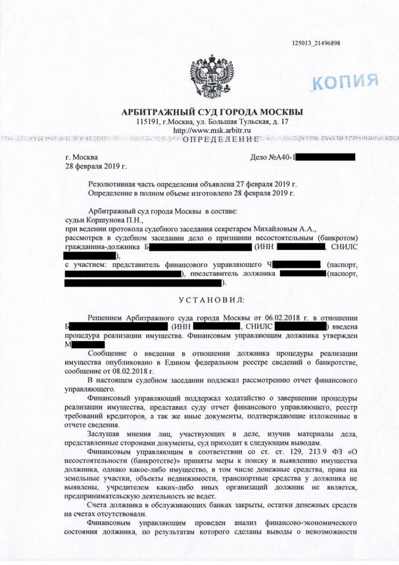 Адвокат разработал правовую позицию для защиты интересов клиента не весь процесс о банкротстве и подал в Арбитражный суд г. Москвы заявление о несостоятельности (банкротстве) физического лица. В рамках действующего соглашения адвокат представлял интересы клиента на всех судебных заседаниях, собраниях кредиторов, а также принял меры к отмене временного ограничения должника на выезд за пределы РФ.