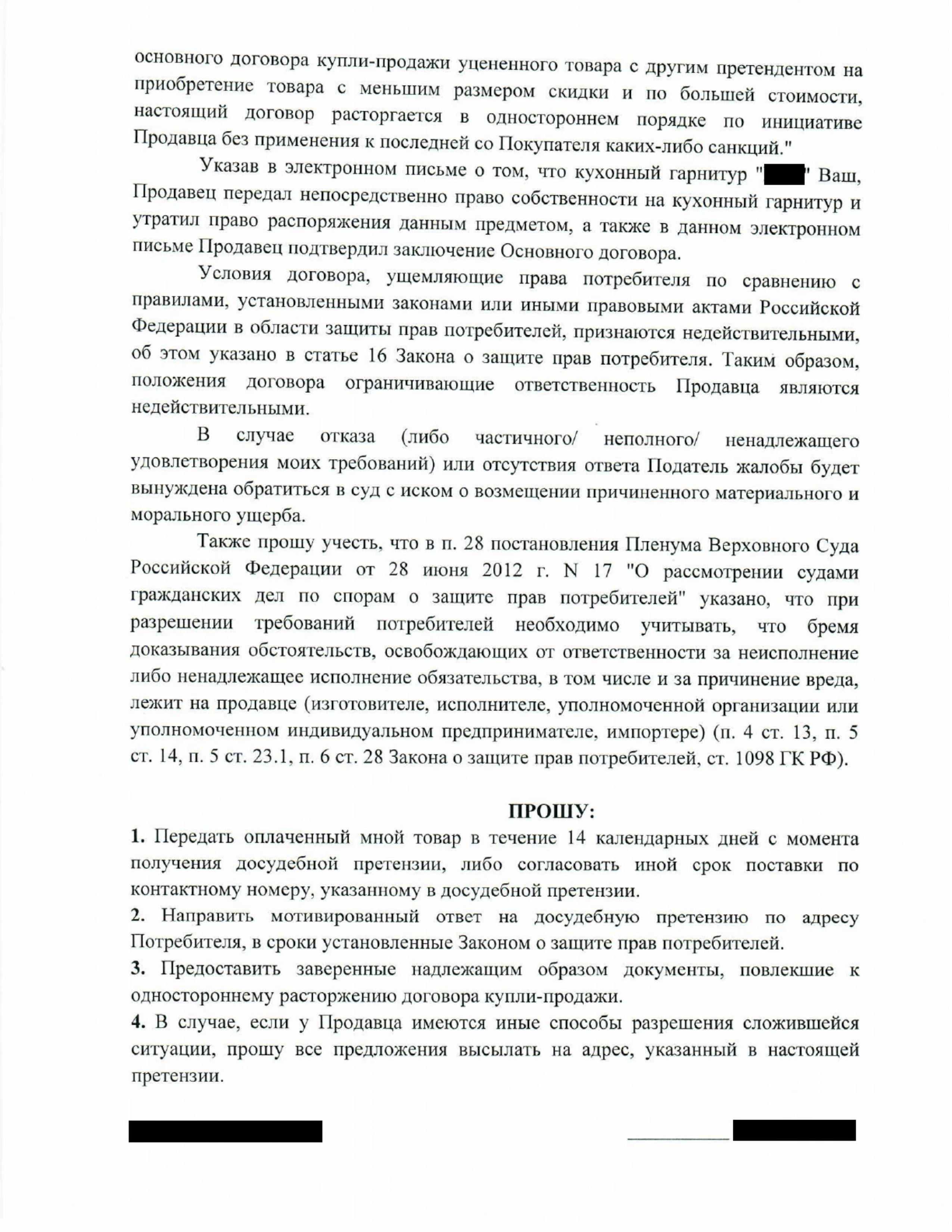 В целях мирного урегулирования вопроса, специалисты нашей компании обратились с досудебной претензией в адрес компании с требованием о передаче соответствующего товара клиентке. Таким образом, по результатам рассмотрения претензии, стороны пришли к соглашению, и компания предоставила нашему Клиенту долгожданный кухонный гарнитур.
