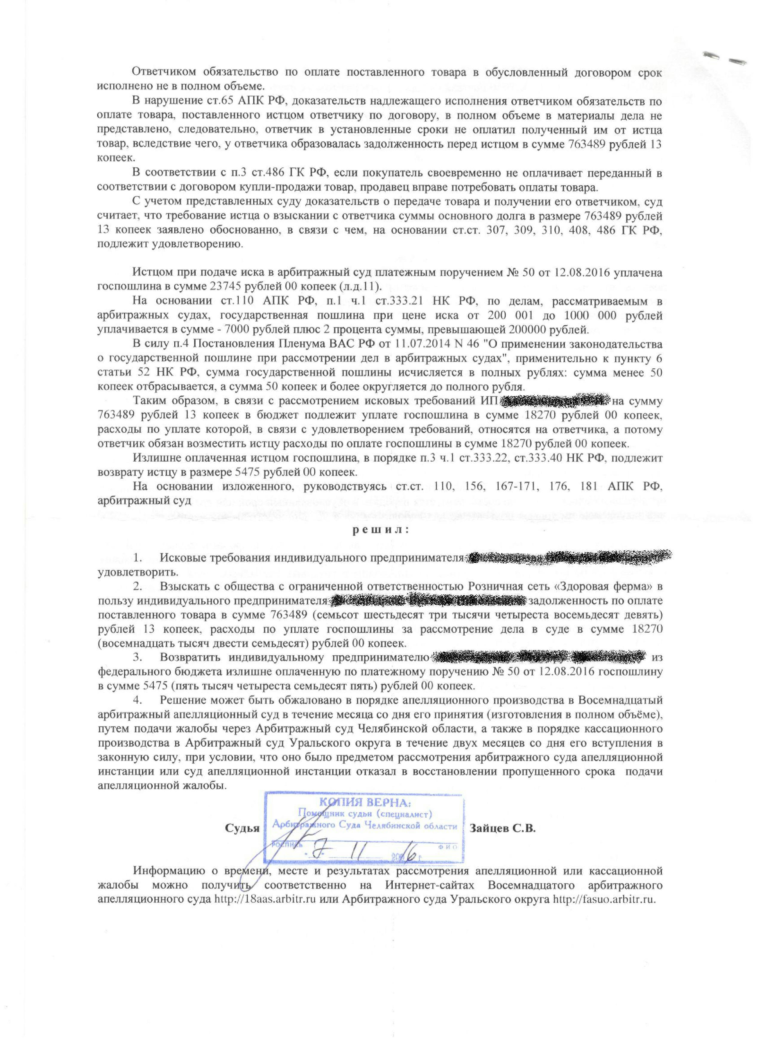 В 2015 году между нашим клиентом — индивидуальным предпринимателем А. — и ООО «Розничная Сеть «Здоровая Ферма» был заключён договор поставки продукции. С мая 2015 по июнь 2016 года клиент исправно поставлял товар, но ответчик оплачивал его не в полном объёме. Образовалась задолженность в размере 763 489 рублей. Клиент обратился к нам. Мы изучили все документы: договор, товарные накладные, счета, акты сверки. Убедившись в обоснованности требований, подготовили исковое заявление и подали его в арбитражный суд вместе с полным пакетом доказательств.