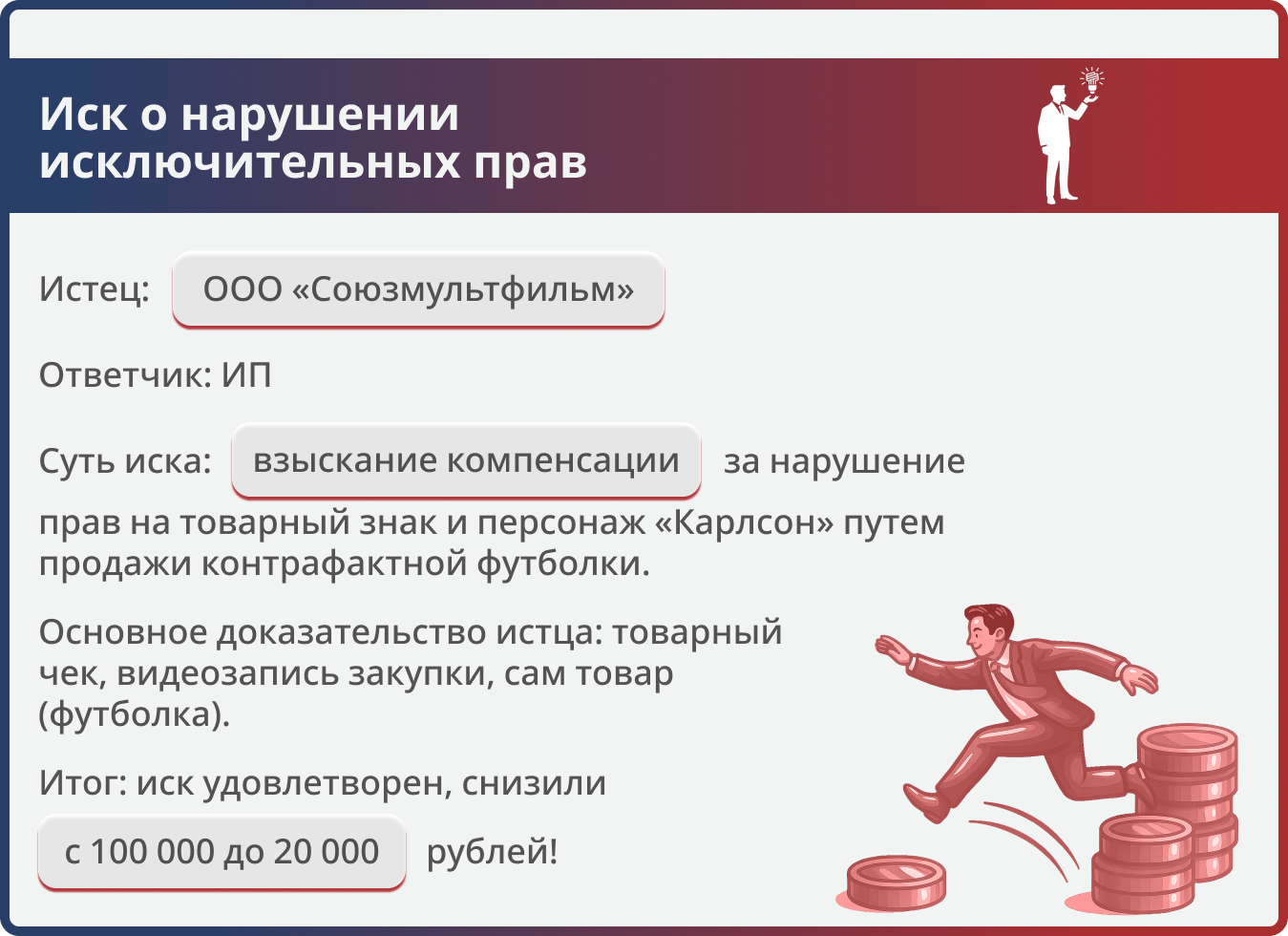 Истцы требовали 100 000 руб. за реализацию одной футболки с товарным знаком студии и изображением персонажа. Юристы компании доказали несоразмерность заявленной суммы, и суд снизил компенсацию в пять раз — до 20 000 руб.