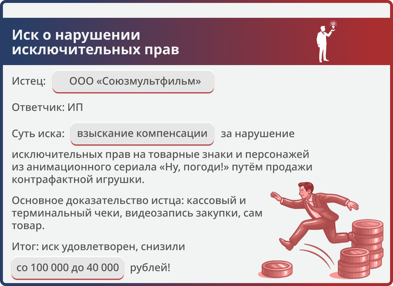 Истцы (АО «Киностудия «Союзмультфильм» и ООО «Союзмультфильм») обратились в суд с иском к иИП о взыскании 100 000 руб. компенсации за нарушение исключительных прав на товарные знаки и произведения изобразительного искусства — рисунки персонажей «Волк» и «Заяц» из анимационного сериала «Ну, погоди!». Основание — продажа в торговой точке в г. Асбесте контрафактной игрушки. Дело рассмотрено в порядке упрощённого производства. В ходе рассмотрения дела истцы самостоятельно уменьшили исковые требования.