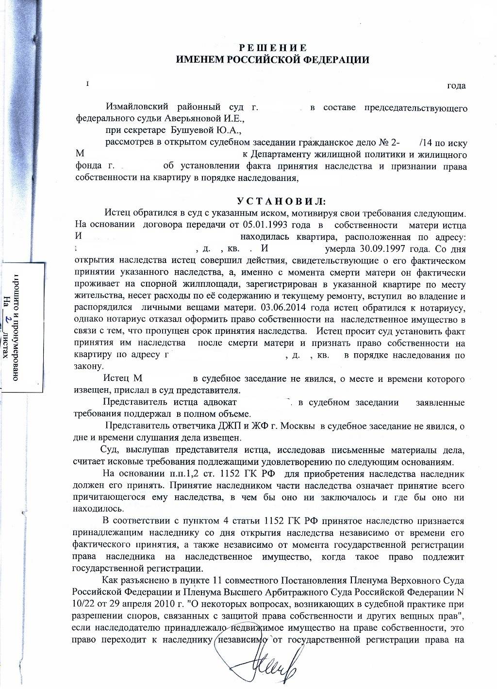 Требования истца были подтверждены договором передачи недвижимости его матери в 1993 году. Мать истца умерла в 1997 году. С момента открытия наследства истец совершал действия, подтверждающие факт принятия наследства по закону, а именно: