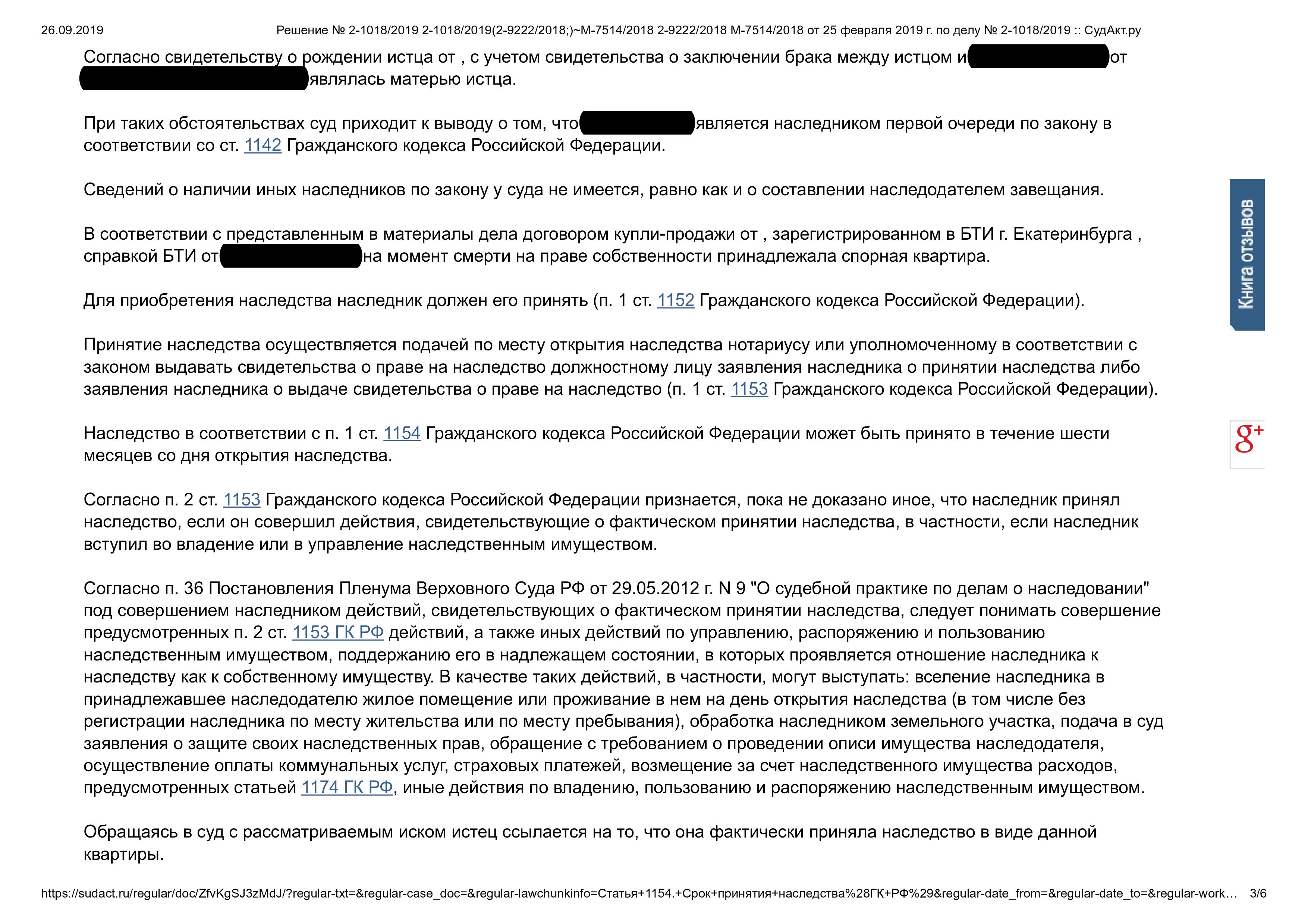 Суд решил: Признать за нашей клиенткой право собственности на жилое помещение в порядке наследования. В удовлетворении встречного иска муниципального образования «Город Екатеринбург» отказать в полном объеме.